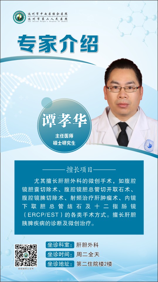 谭孝华 ,达州市中西医结合医院肝胆外科主任医师 ,硕士研究生,1998年毕业于重庆医科大学临床医学系本科,2006年硕士研究生毕业于重庆医科大学外科学专业,研究方向:肝移植。长期从事肝胆胰脾外科工作,临床经验丰富。先后在第三军医大学大坪医院肝胆外科、上海同济大学仁济医院肿瘤介入科进修学习。分别在《国际外科学》、《中国现代普通外科进展》、《重庆医学》等杂志发表论文数篇,擅长肝胆胰脾外科各种疾病的诊治及各类手术。尤其擅长肝胆外科的微创手术,如腹腔镜胆囊切除术、腹腔镜胆总管切开取石术、腹腔镜脾切除术、射频治疗肝肿瘤术、内镜下取胆总管结石及十二指肠镜(ERCP/EST)的各类手术方式。
