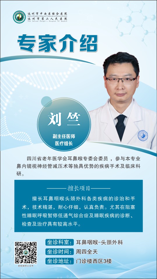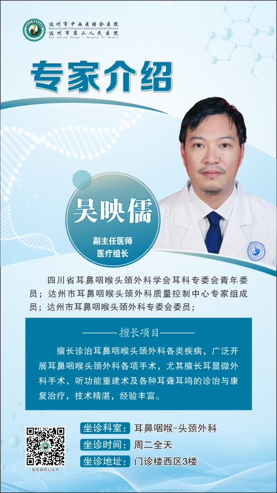 耳鼻咽喉头颈外科是达州市医疗质量控制中心所在地,是达州市本专业唯一的四川省级医学甲级重点专科和市级重点学科。设听力实验室、睡眠实验室、ABR实验室、医院眩晕病诊治中心、VNG实验室。现有医护人员40余人,其中主任医师3人,国务院政府津贴专家和省突出贡献优秀专家各1人。