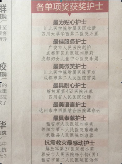 5月30日,由四川省护理学会、华西医院、四川省人民医院等卫生行业主管部门和权威专家组成的评审委员会,对“第二届四川最美护士”近百名候选人进行评审,从行为美、心灵美、医院评价、病人反馈等多方面对众多参评护士进行全方位考察。经过层层筛选,“四川十大最美护士”,以及“最佳服务护士”、“最美微笑护士”、“最有耐心护士”、“最具奉献护士”、“最美语言护士”、“最为贴心护士”6个单项奖和抗震救灾特别奖“最感动护士”正式出炉,我院骨科主管护师谭彩云脱颖而出,喜获单项奖“最美语言护士”的称号。据悉,6月,组委会将为获奖者举行隆重的颁奖典礼,届时再行追踪报道。(护理部)