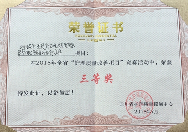 该项目于2018年7月下旬代表达州市护理质量控制中心成功入围四川省护理质量改善项目竞赛决赛,得到省内护理专家好评,取得“四川省护理质量改善项目三等奖”的好成绩,并于9月荣获“第四届中国护理质量大会‘护理质量提灯奖’推荐奖”的荣誉。