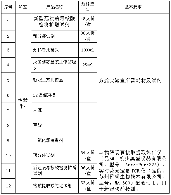 2022年2月23日,我院对检验科方舱实验室使用的耗材及体外诊断试剂作市场调查和询价。截止2022年2月28日下午17:30,递交的报价资料未达到最低三家的要求,我院决定发布“检验科方舱实验室使用的耗材及体外诊断试剂”第二次市场调查和询价公告,现将有关事项公告如下: