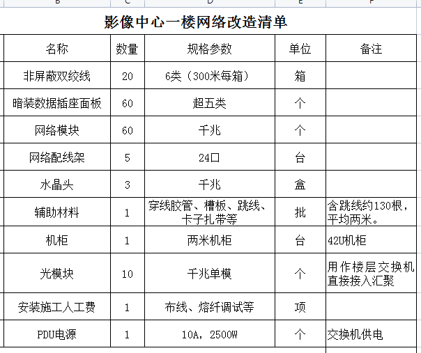 二、项目概述:将影像中心一楼网络线路改造至二楼,同时将原有的网络线路及设备清理。具体项目清单如下:
